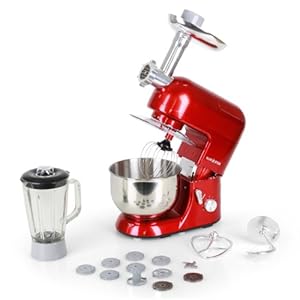 Características de Klarstein Lucia Rossa Robot de cocina multifunción batidora, amasadora, picadora, licuadora. Adecuada para hacer claras a punto de nieve, cremas de crepes, masa de pan, pasta y picar (Varios accesorios para carne y pasta, vaso mezclador de cristal 1,5l, recipiente de acero inoxidable de 5l, 1200W) Rojo