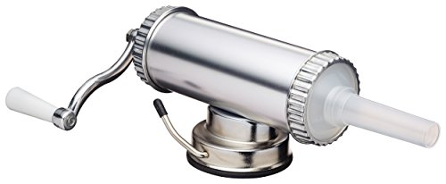Haz tus propios embutidos como chorizo, salchichas y demás con la ayuda de esta máquina para embutir. Con una base con ventosa que la sujeta firmemente a la mesa de trabajo, el embutidor incluye embudos de tres tamaños (15mm / 19mm / 22mm) para hacer embutidos de distintos calibres. El pistón tiene capacidad para 1 kilo de carne.